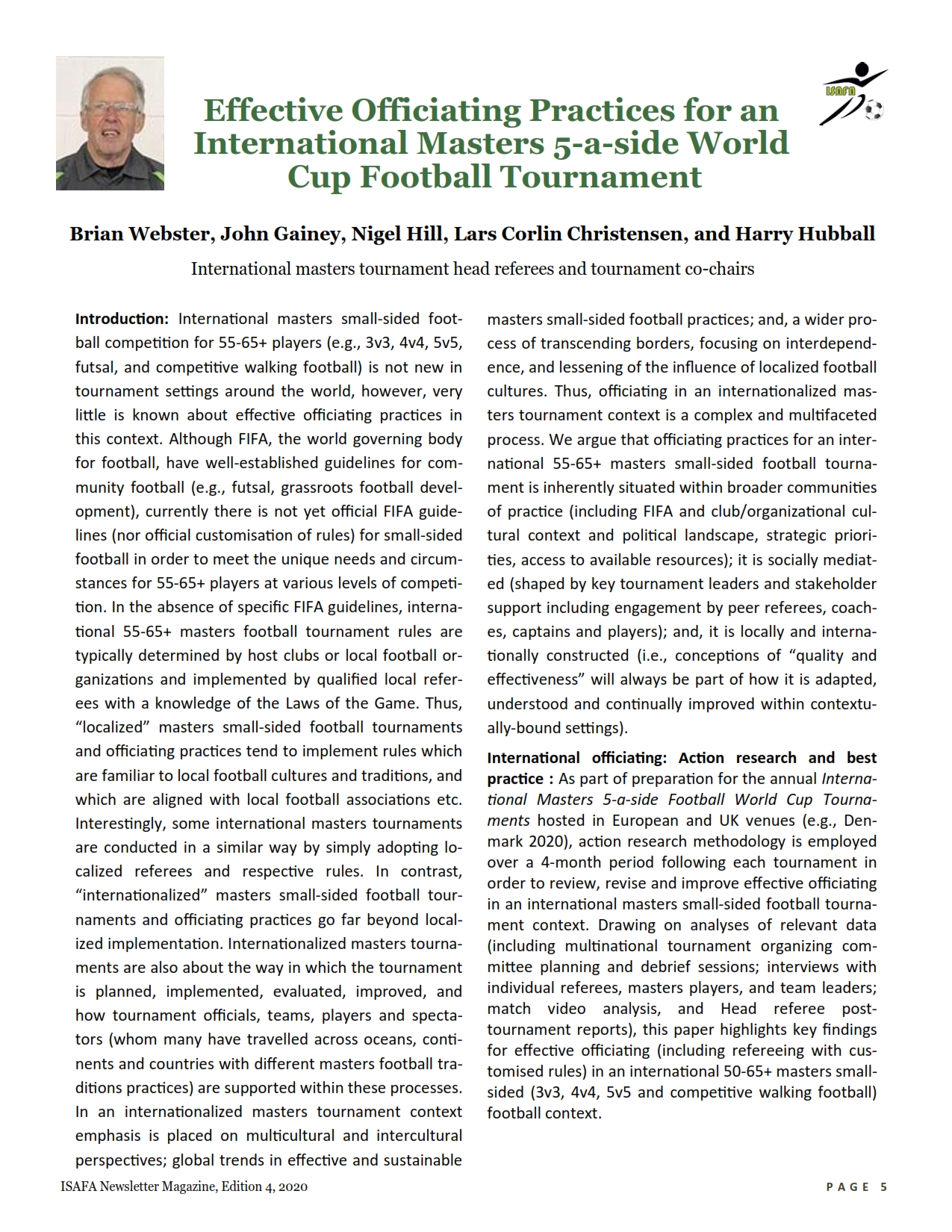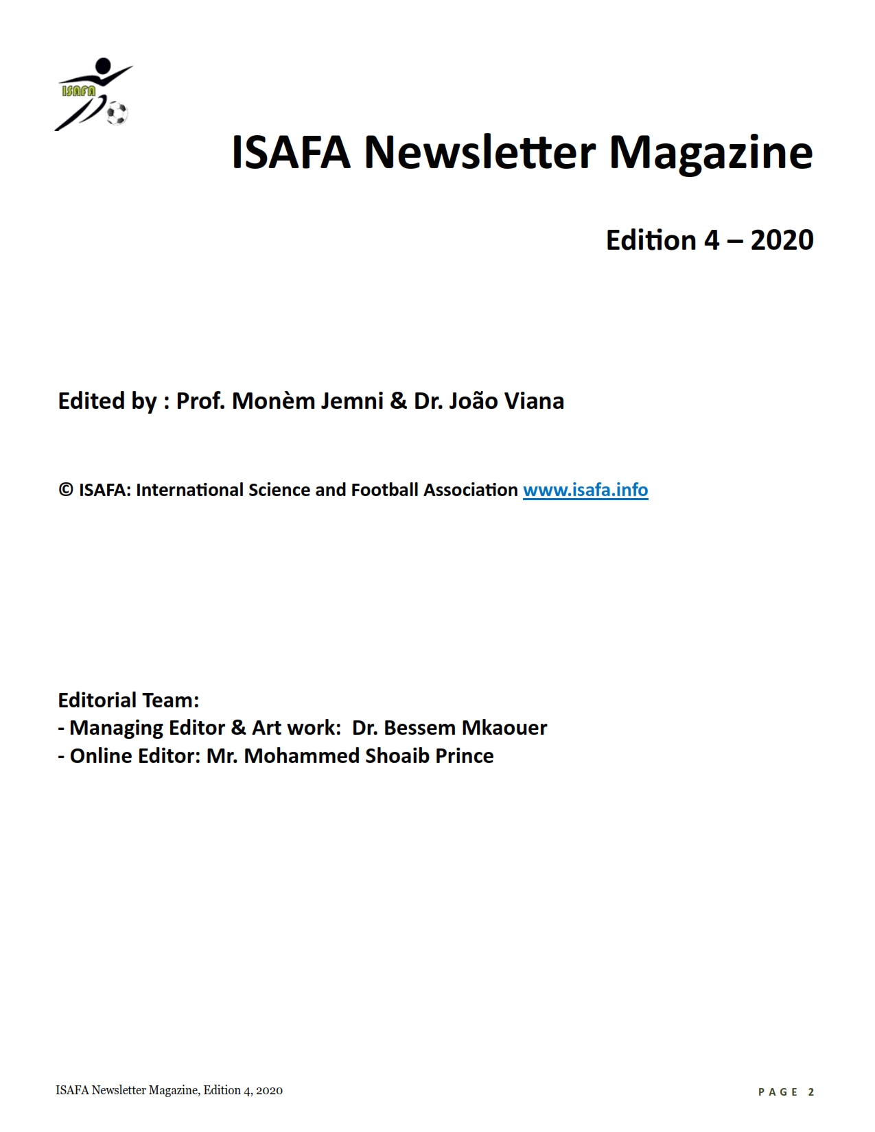 It is an unprecedented time that the world is going through at this moment… 2020 will be a year to re-member for generations to come, where the Covid-19 virus has put the entire world at its knees. Giant corporates, business, academic institutions, enterprises shut down and towns transformed into ghost cities. Meanwhile, scientists with different backgrounds have been working hard and against the clock to find ways to remedy to this global pandemic and to help people getting-by from day-to-day. The ISAFA has made an effort from its side to shed some light on the challenges and the opportunities this current situation has brought thanks to all its members and volunteers. Hence, this edition has included exam-ples of good practices that few football clubs have used to overcome the confinement imposed by all countries (check the interview with Sean Malcolm and the report by Arben Asllani). Some difficulties and hurdles are also highlighted.